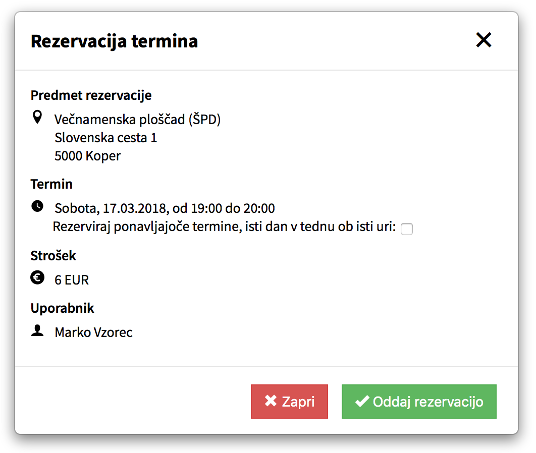 Po kliku na izbran termin (ali poteg čez več terminov) se odpre spodaj prikazano okno s podrobnostmi rezervacije. S klikom na “Oddaj naročilo” je e-rezervacija izvedena.