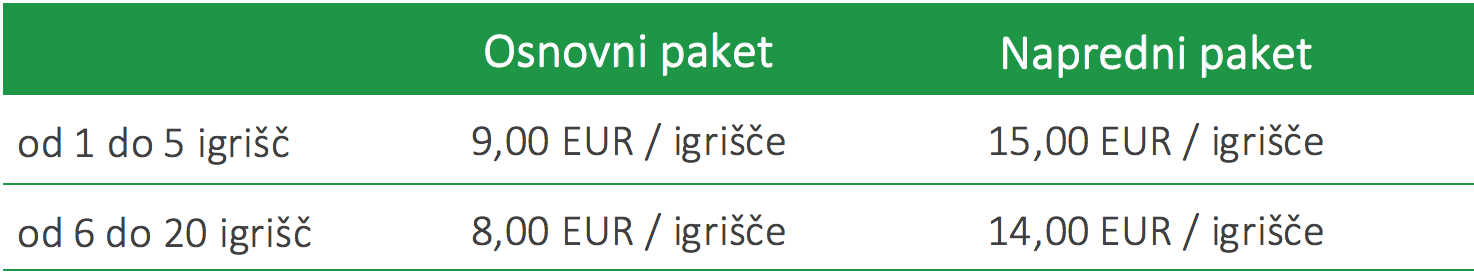 - napredni paket 15,00 EUR za eno igrišče, za 6 ali več igrišč pa 14,00 EUR na igrišče.